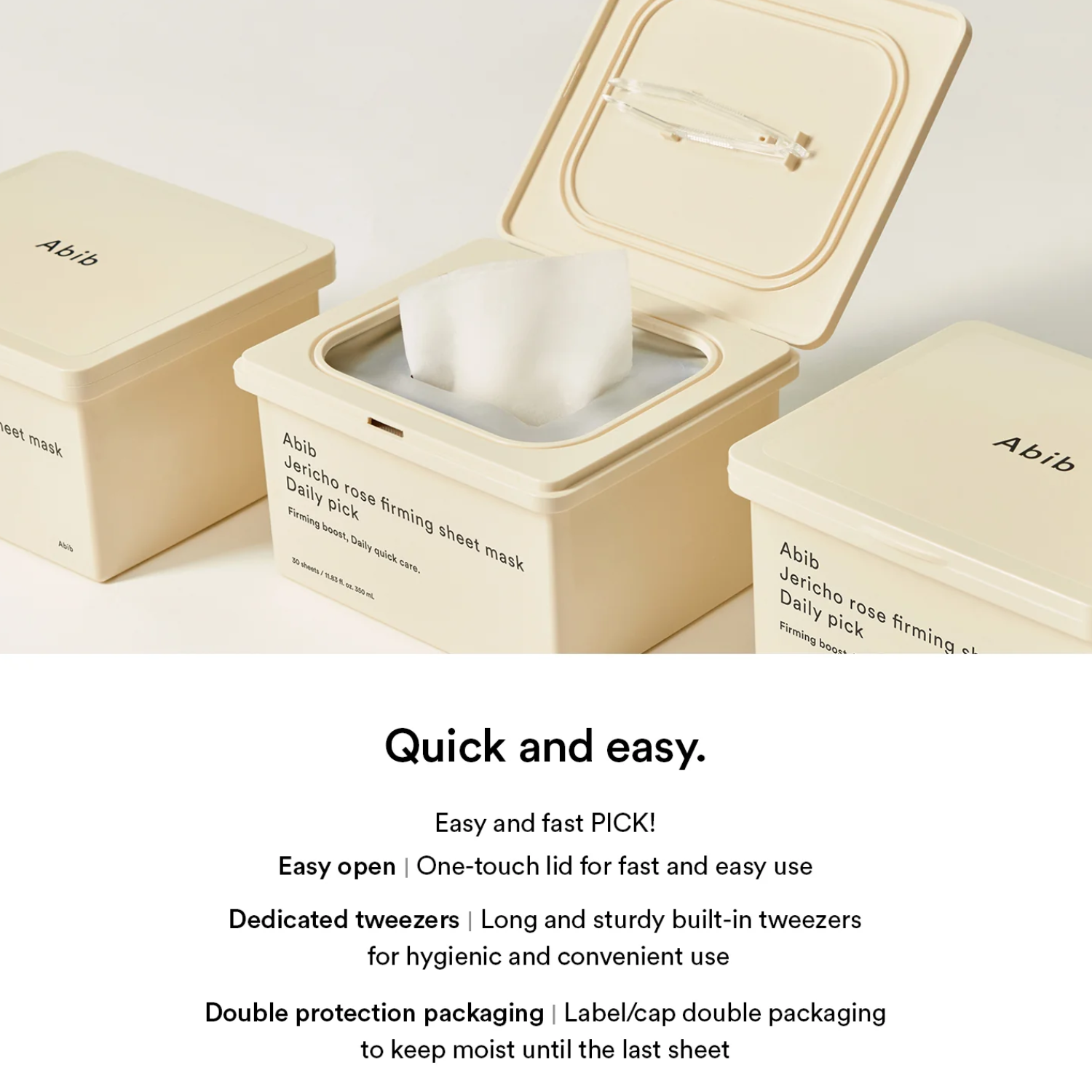 ABIB Jericho Rose Firming Sheet Mask Daily Pick is a daily treatment mask designed to deeply hydrate while helping improve skin elasticity and firmness. Enriched with Jericho Rose (Anastatica Hierochuntica) Extract and Trehalose, it helps revitalize and care for tired-looking skin. A blend of Hyaluronic Acid, peptides, and Adenosine delivers lasting moisture to keep skin smooth, plump, and refreshed. The 0.3mm ultra-slim vegan sheet adheres comfortably to help absorb the nourishing essence, providing gentle care with minimal irritation. Ideal for daily use when your skin needs hydration and a boost of resilience.