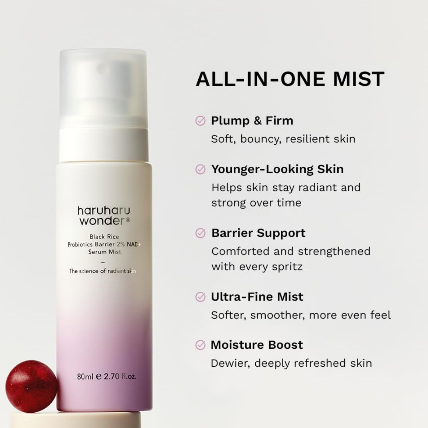 HARUHARU WONDER Black Rice Probiotics Barrier 2% NAD+ Serum Mist is a lightweight, creamy mist designed to hydrate, soothe, and strengthen the skin barrier throughout the day. Formulated with NAD+ and a 5 Ceramide Complex, it helps replenish moisture while supporting skin elasticity and a healthier-looking complexion. Galactomyces Ferment Filtrate and Bifida Ferment Filtrate work to calm sensitive skin and refine uneven texture, while Panthenol, Squalane, and Rice Lees Extract boost hydration and comfort. The ultra-fine mist absorbs easily without stickiness, making it ideal for refreshing skin anytime it feels dry or dull.