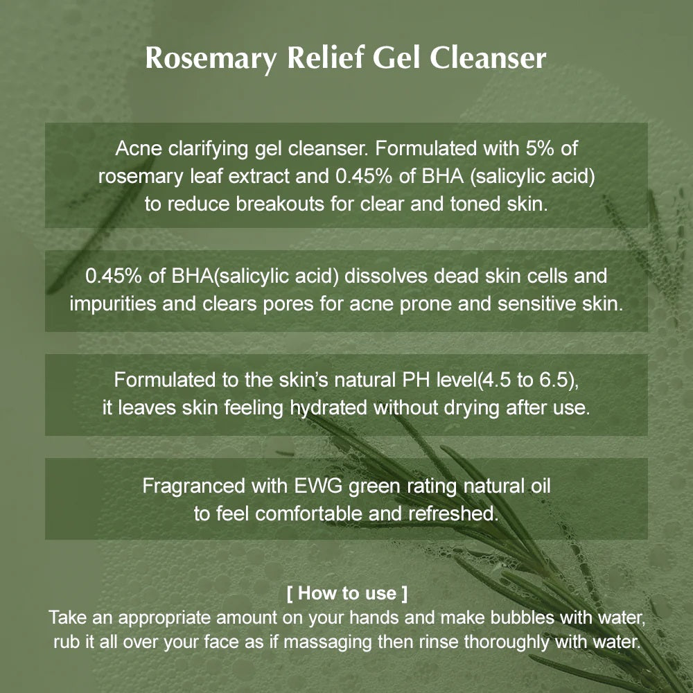 KAINE Rosemary Relief Gel Cleanser is a gentle, soothing gel cleanser formulated to calm and refresh sensitive and troubled skin. Infused with Rosemary Leaf Extract, Artemisia Water, and Salicylic Acid, it helps to cleanse pores, control excess oil, and reduce inflammation without stripping moisture. A blend of Hyaluronic Acid, Panthenol, and plant extracts like Spinach, Cabbage, and Broccoli keeps the skin hydrated and balanced. Ideal for daily use on oily, sensitive, or acne-prone skin.