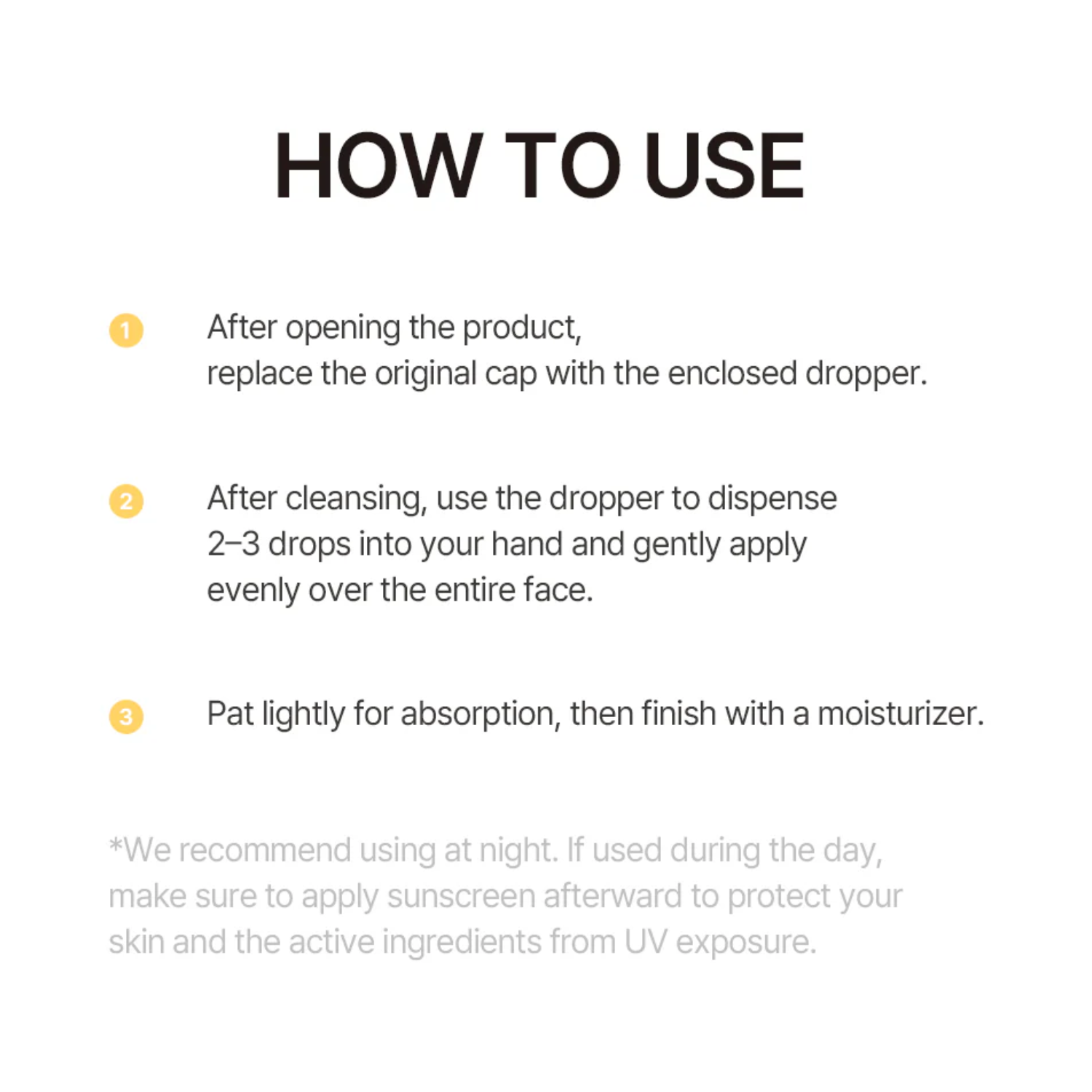 Apply 2-3 drops on clean skin and gently massage to aid absorption. If used in daytime, follow up with sunscreen.