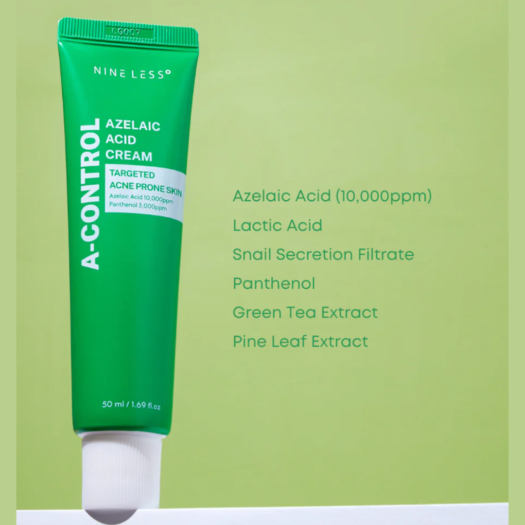 NINELESS A-Control Azelaic Acid Cream is a multi-functional moisturizer designed to target acne, redness, and uneven skin tone. Formulated with Azelaic Acid, it helps reduce breakouts, fade dark spots, and balance excess oil. Enriched with Snail Secretion Filtrate and Panthenol, it soothes and hydrates, while Centella Asiatica Extract and Green Tea Extract calm irritation and support skin healing. The lightweight, non-greasy texture absorbs quickly, leaving the skin smooth, clear, and refreshed. Perfect for acne-prone and sensitive skin types.