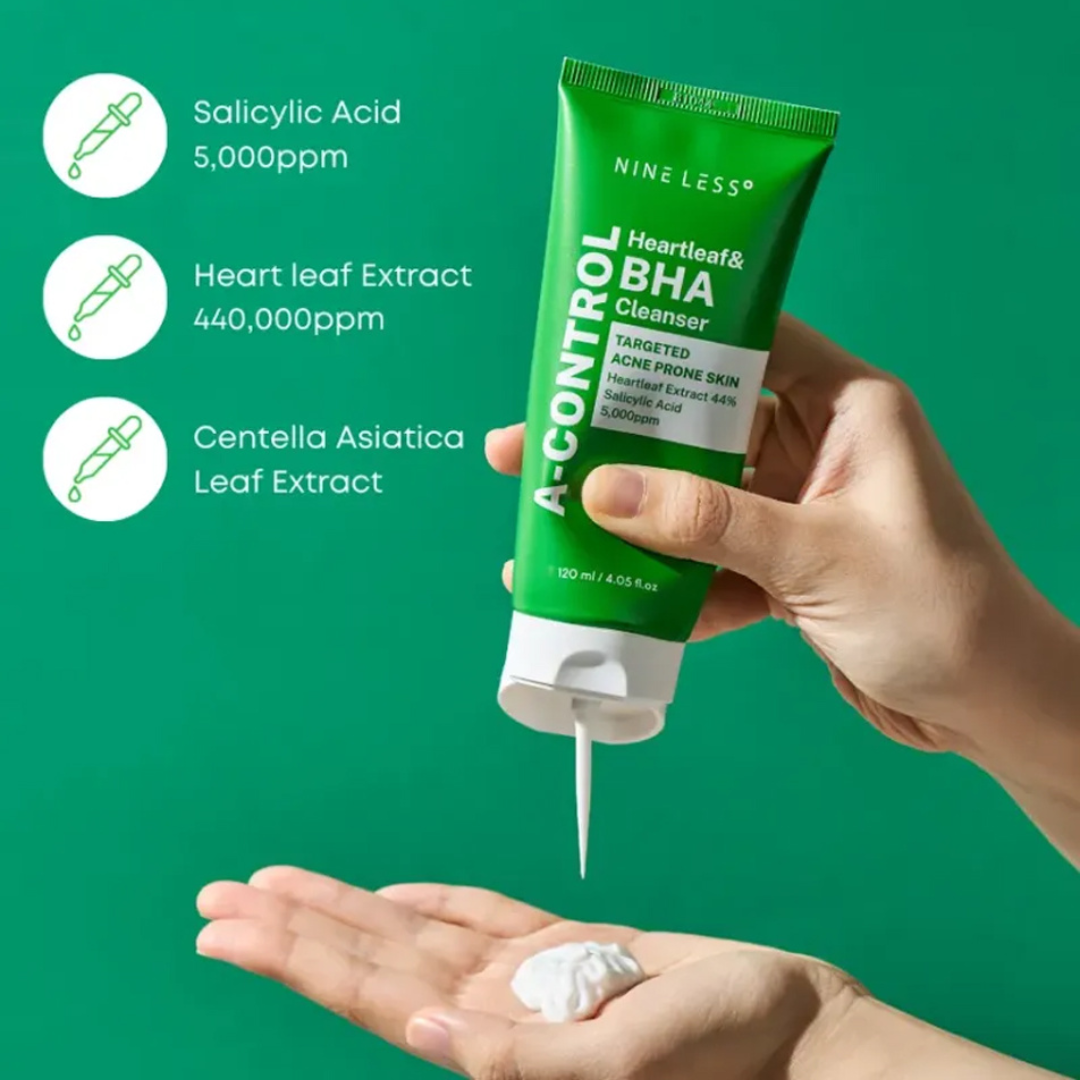 NINELESS A-Control Heartleaf & BHA Cleanser is a powerful facial cleanser formulated with high concentrations of Houttuynia Cordata Extract and Salicylic Acid. This unique combination deeply cleanses pores, reduces breakouts, and controls oil production. Enriched with natural ingredients like Willow Bark and Green Tea Extract, it also soothes and protects the skin. Ideal for oily and acne-prone skin types, this cleanser leaves the skin feeling refreshed and clear without stripping moisture.