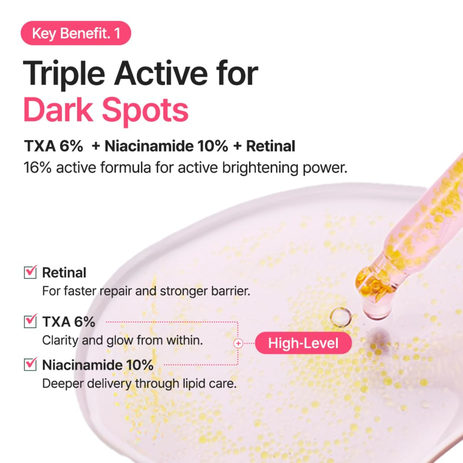 • PURITO SEOUL TXA 6 Niacinamide 10 Retinal Serum is a multi-functional brightening and anti-aging serum that helps improve skin tone, texture, and elasticity. Formulated with 10% Niacinamide, Tranexamic Acid, and Retinal, it targets dark spots, uneven tone, and fine lines for a clearer, smoother complexion. Enriched with Centella Asiatica Extract, Ceramide NP, and Glutathione, it soothes, hydrates, and strengthens the skin barrier while promoting a radiant, youthful glow.