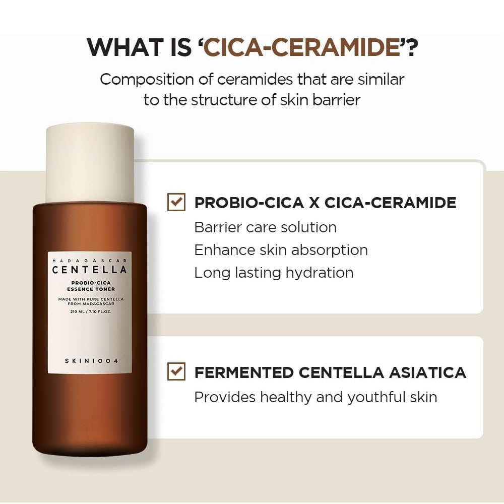 SKIN1004 Madagascar Centella Probio-Cica Essence Toner is a nourishing formula that hydrates and soothes the skin. Featuring Centella Asiatica Extract and its ferment filtrate, this toner boosts skin healing and calms irritation. It's enriched with Panthenol, Hyaluronic Acid, and Ceramide NP, which help maintain moisture levels and strengthen the skin barrier. Additionally, ingredients like Madecassic Acid and Asiaticoside enhance skin texture and resilience. Suitable for all skin types, this essence toner leaves skin soft, refreshed, and balanced.