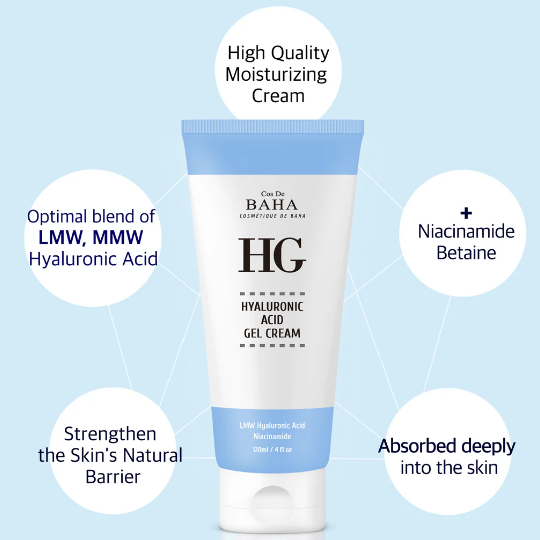 • COS DE BAHA (HG) Hyaluronic Acid Gel Cream is a deeply hydrating moisturizer ideal for all skin types, especially beneficial for those with dry or dehydrated skin. The formula features multiple forms of Hyaluronic Acid—including Sodium Hyaluronate, Hydrolyzed Hyaluronic Acid, and Sodium Acetylated Hyaluronate—to intensely moisturize and plump the skin, reducing the appearance of fine lines. Enriched with Niacinamide and Panthenol, it enhances skin tone and strengthens the skin barrier. Aloe Barbadensis Leaf Extract and Glycerin provide soothing hydration, while antioxidants like Green Tea Extract protect against environmental damage.