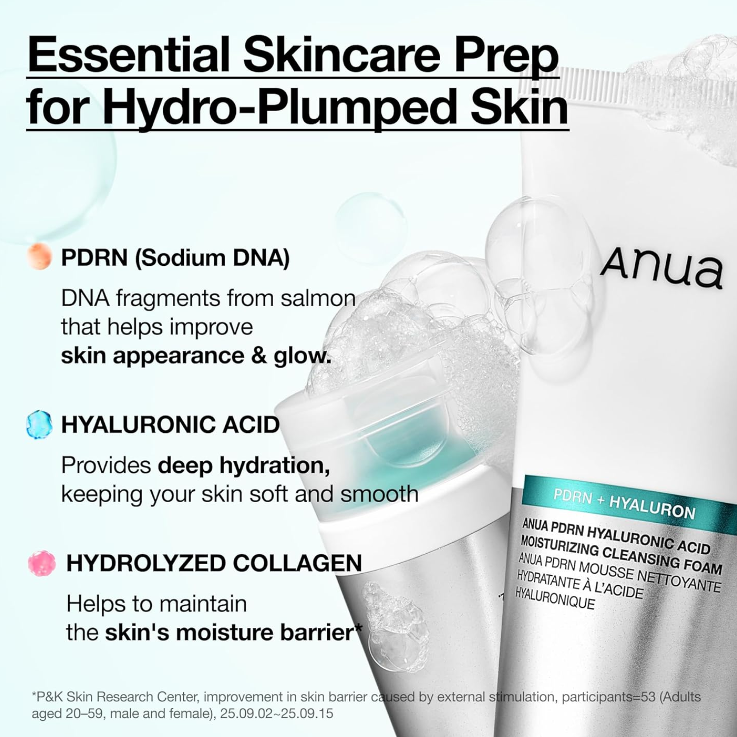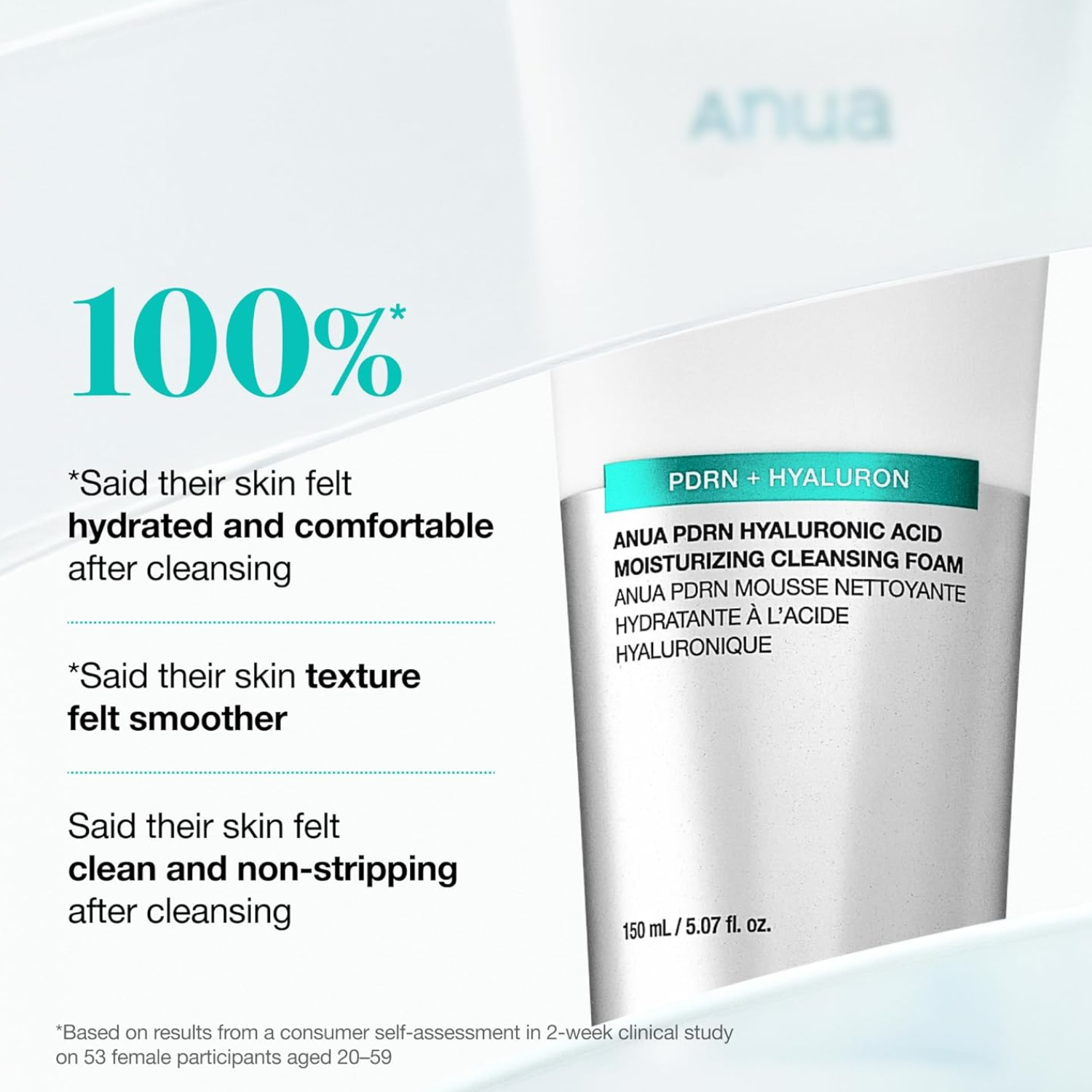ANUA PDRN Hyaluronic Acid Moisturizing Cleansing Foam is a hydrating daily cleanser that gently removes impurities without stripping the skin. Enriched with PDRN (Sodium DNA) and multiple forms of Hyaluronic Acid, it helps deliver deep moisture while maintaining a healthy, radiant complexion. Hydrolyzed Collagen supports skin elasticity, while Ceramide NP, Panthenol, and Allantoin help strengthen and soothe the moisture barrier. The soft cream texture transforms into a rich, cushiony lather, leaving skin smooth, refreshed, and comfortably hydrated. It can also be used as a pack-to-foam for an extra boost of hydration during cleansing.