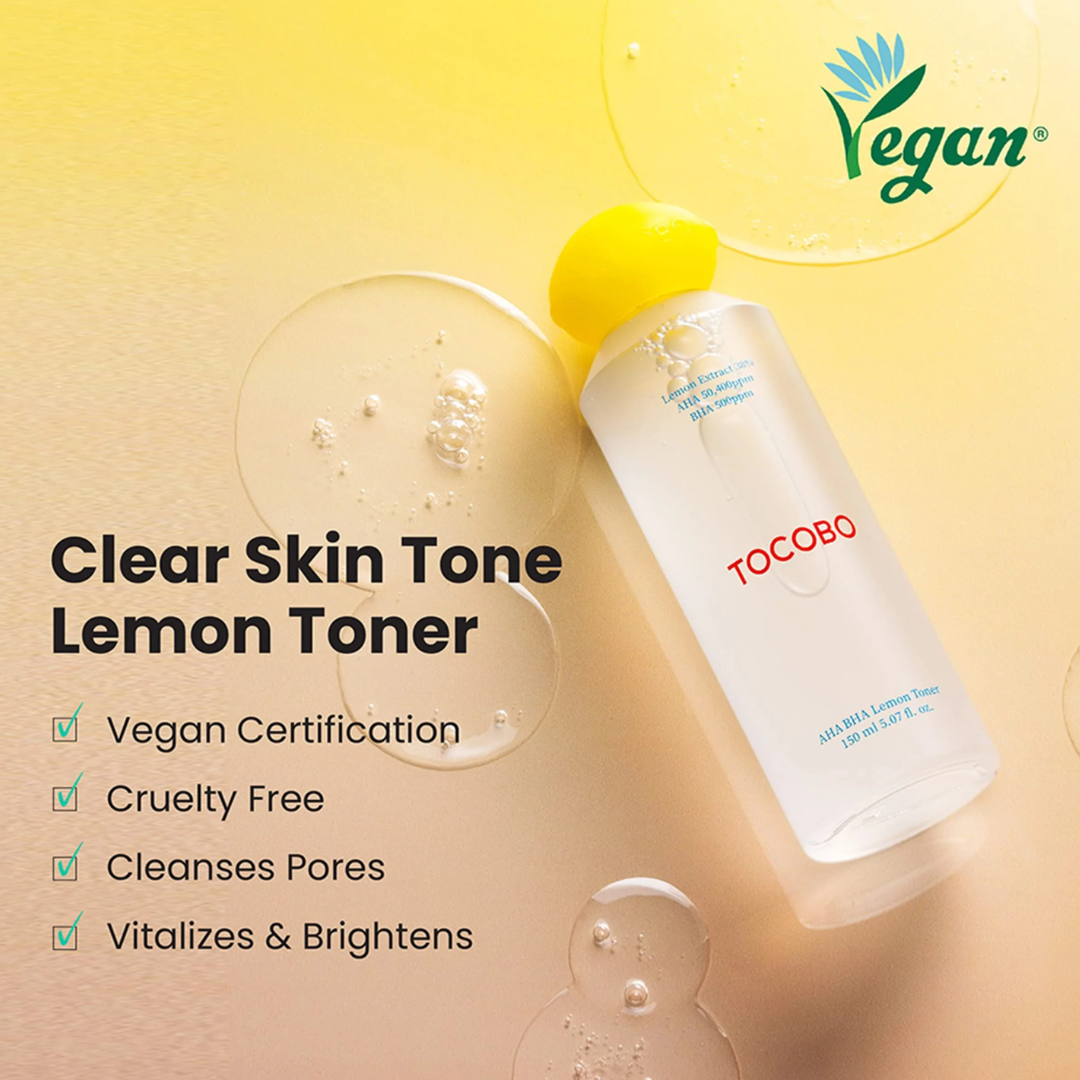 TOCOBO AHA BHA Lemon Toner is a refreshing exfoliating toner designed to brighten and smooth the skin. Enriched with Citrus Lemon Fruit Extract and a blend of AHA (Glycolic Acid) and BHA (Salicylic Acid), it gently removes dead skin cells, unclogs pores, and refines the skin's texture. Infused with soothing ingredients like Panthenol, Beta-Glucan, and Allantoin, it helps to calm and hydrate, leaving the skin clear and glowing. Perfect for oily and combination skin types, this toner delivers a balanced, revitalized complexion with a fresh citrus scent.